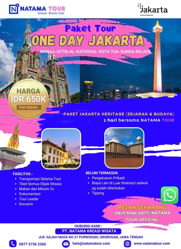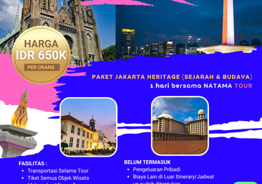 Paket wisata ini mengajak peserta menjelajahi ikon sejarah, religi, dan budaya Jakarta dalam satu perjalanan. Dimulai dari Monumen Nasional (Monas) sebagai simbol perjuangan bangsa, dilanjutkan ke Masjid Istiqlal dan Gereja Katedral yang mencerminkan kerukunan antarumat beragama. Perjalanan berlanjut ke kawasan bersejarah Kota Tua Jakarta dengan bangunan peninggalan kolonial dan museum, lalu ditutup di Pelabuhan Sunda Kelapa yang menyajikan suasana pelabuhan tradisional dengan kapal pinisi. Paket ini cocok untuk wisata edukasi, religi, dan sejarah dengan durasi singkat namun berkesan.